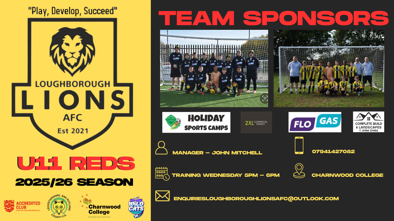 Formed in 2021 alongside the founding of the club, Loughborough Lions U11 Reds have quickly grown into a strong and ambitious team within the Leicestershire Junior Football Leagues. Led by head coach and club founder John Mitchell (who also runs JM Football Academy & Holiday Sports Camps) and supported by assistant coach Kev (whose son is part of the squad). The team is built around a solid foundation based on development, teamwork, passion for the game and FUN.