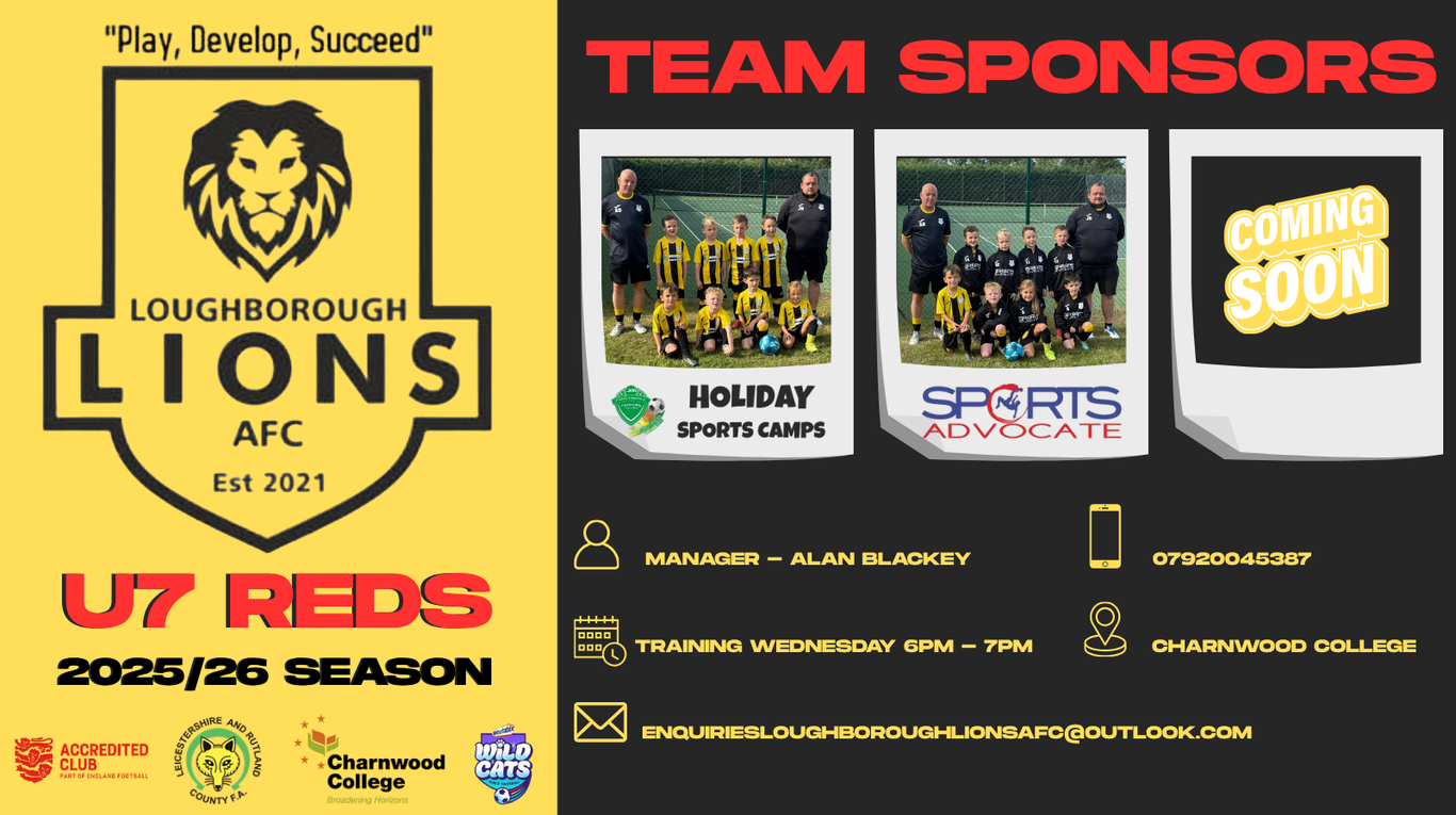 In their first season together (many who have come through the Lions Minis Academy), the Loughborough Lions U7 Reds are already developing into a strong, energetic and close-knit team competing in Level 3 of the Leicestershire junior football pathway. The squad is led by manager Allan Blackey, who proudly coaches his grandson Rio, bringing a real family spirit to the touchline. Supporting him is assistant coach Jorden Blackey, Allan’s son, who also plays an active role in helping the young players grow in confidence and ability.
